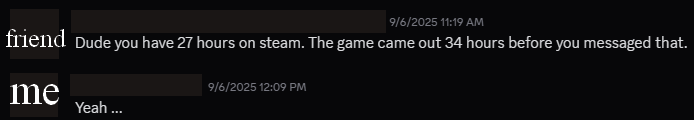 on the first day, i played it for 17 hours straight. i fell into a dissociative fugue where i barely ate or slept as i Just played silksong. this is a thing i do with videogames that are good. the doctors call it Gamer Syndrome (autism). regardless, i got the first ending in two days and was probably among some of the first people to ever finish it. like. look at this exchange i had with a friend